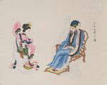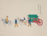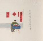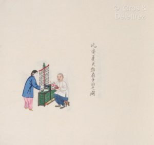 CHINE - Epoque de la République - MINGUO (1912 - 1949) Ensemble de cinq albums Encre et couleurs sur papier 1er Volume : 5 pages : couples des dynasties, Tang, Song, Yuan, Ming et Qing. Dim. 25 x 34 cm 2e Volume : 12 pages : différentes personnes et leurs métiers. Dim. 16,5 x 18,5 cm 3e Volume : 12 pages : marchands de fleurs, vendeur de gâteaux etc. Dim. 16,5 x 18,5 cm 4e Volume : 18 pages : enseignes de magasins (prêteurs sur gage, vêtements, thé etc). Dim. 25,5 x 33,5 cm 5e Volume : 11 pages : caravanes de chameaux, chaises à porteurs, calèches etc. Dim. 25,5 x 33,5 cm Cachet de peintre ZHOU Qiliang et l'adresse de son atelier à Pekin. Dim. 25,5 x 33,5 cm. ; 16,5 x 18,5 cm. (Usures)