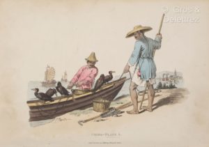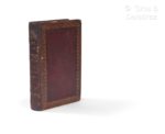 ALEXANDER (William). Picturesque representations of the dress and manners of the Chinese. Illustrated in fifty coloured engravings with descriptions. London, James Godwin, [plates by John Murray, 1814]. In-8, [2] f. (titre, liste des pl.), pl., maroquin à longs grains grenat de l’époque, dos à 4 nerfs larges et plats, plats bordés de 2 larges roulettes, l’une dorée et l’autre à froid, roulette dorée aux chasses, tranches dorées (dos et coins restaurés sans finesse avec fragments du dos d’origine conservés ; qq. salissures ; déch. sans manque à la pl. 15). Nouvelle édition qui reproduit l’originale de 1808 dans un format plus réduit. Ouvrage comprenant 50 planches gravées et coloriées, dont un frontispice et un titre, chacune accompagnée d’un feuillet de commentaire. Provenance : ex-libris armorié gravé XIXe s. ; Margaret Hopkins (sign. sur une garde) ; W.H. Hopkins, California (cachet aux gardes).