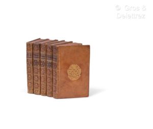 [Reliure aux armes]. ARGENS (Jean-Baptiste de Boyer d’). Lettres chinoises, ou correspondance philosophique historique & critique A la Haye, P. Gosse, 1751. 5 vol. in-12, veau fauve de l'époque, dos lisse compartimenté, pièces de titre et tomaison brunes, armes frappées sur les plats, dentelle intérieure, tranches rouges (lég. frott. sur les mors, coupes et coins, taches sur le plat sup. du vol. 3, épidermures sur le plat sup. des vol. 2 et 4, perte de dorure sur les armes au plat sup du vol.1). Nouvelle édition augmentée de ce recueil politico-philosophique, comprenant 149 lettres. Provenance : Barthélemy-François Thoinard, maître des requêtes et fermier général de 1724 à 1750 (armes aux plats).