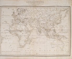 BLANCARD (Pierre). Manuel du commerce des Indes Orientales et de la Chine. A Paris, Caille et Ravier, 1806. Petit in-folio, [1] f., LXXIII-544-72 p., [12] f., pl. demi-chagrin marron de l'époque, dos à 5 nerfs, titre et auteur dorés, filet à froid sur le dos et les plats, non rogné (dos lég. passé, coupes frottées, faux-titre et titre restaurés, rousseurs et deux petites fentes au niveau des pliures de la carte). Rare et unique édition ancienne de ce traité composé par Pierre Blancard, capitaine de marine originaire de Marseille (1741-1826). Elle est illustrée d’une carte hydrographique dépliante gravée par Blondeau d'après Lapie, couvrant l'océan Atlantique jusqu'à l'Australie, comprenant l'Afrique et certaines parties de l'Europe et de l'Asie. Exemplaire très grand de marges et imprimé sur papier azuré. (Kress 19225).