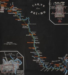 [Carte géographique]. [Manuscrit]. Carte du Peï-Ho. [Paris, vers 1888?]. Une carte manuscrite sur papier, env. 200 x 180 cm., entoilage et gorge et rouleau de bois blanc modernes, qq. restaurations en bordures (qq. marques de plis et petits accrocs sans gravité). Unique et importante carte peinte en couleurs sur papier noir, très probablement réalisée à la demande de l’orientaliste français Henri Cordier (1849-1925), en vue d’illustrer l’un des cours d’histoire de l’Extrême-Orient qu’il donna à Paris, à l’Ecole des Langues orientales. Intitulée «Carte du Peï=Ho», elle témoigne du dernier épisode de la guerre qui opposa les alliés français et britanniques à l’Empire de Chine, entre fin août et mi-octobre 1860. Le traité qui suivit mit fin à ce qu’il est convenu d’appeler «La Guerre de l’Opium». La zone géographique représentée suit le cours du fleuve, depuis Pékin jusqu’à son embouchure en Mer Jaune, à l’est de Tientsin (actuellement, la ville de Tianjin ou Tientsin s’étend jusqu’à la mer). L’intérêt principal de la carte est de situer les camps et bivouacs militaires français le long du fleuve, et de signaler pour chacun la date de son établissement, illustrant ainsi la progression des troupes entre le 12 août et le 17 septembre. En approchant de Pékin, l’on trouve les mentions d’un «camp des alliés», puis autour de la ville, de plusieurs autres camps français et anglais, également avec leurs dates d’activité. La carte indique également de nombreuses localités sur les deux rives du fleuve. L’échelle est mentionnée sur le document, 20 kilomètres représentés par 30 centimètres, soit env. 1: 67 000ème. Le fleuve et ses affluents sont peints en bleu, les routes en jaune, la végétation en vert; les noms des camps et bivouacs sont en orangé, ceux des autres lieux sont en blanc. La feuille présente deux cartons. Le premier, en bas à gauche, offre un plan de la ville de Tientsin, à 1: 5000ème, avec l’emplacement de la flottille anglo-française qui l’occupe, dont les navires sont représentés en rouge et blanc. Le second carton, en haut à droite, présente un plan de la ville de Pékin, sans échelle mentionnée, avec les délimitations de la ville chinoise - comprenant les plans de deux temples -, de la ville tartare, et au centre, de la ville impériale. Le plan de la porte Gan-ting y est également représenté. La carte a fait l’objet d’un entoilage et montage sur gorge et rouleau récent et soigné. L’on a conservé une étiquette ancienne portant la mention «M. Henri Cordier - 1888».
