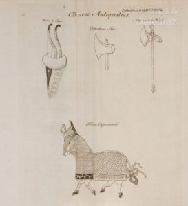 CIBOT (Pierre-Martial). Lettre de Pékin sur le génie de la langue chinoise et la nature de leur écriture symbolique, comparée avec celle des anciens Egyptiens... On y a joint l'Extrait de deux ouvrages nouveaux de M. de Guignes,... relatifs aux mêmes matières. A Bruxelles, chez J. L. de Boubers, 1773. In-4, XXXVIII-46 p. (mal chiffré pour 49), [3] f. (trad. des mots anglais), [1] f. blanc, pl., veau fauve époque, dos à 5 nerfs, pièce de titre assortie, caissons ornés, roulette dorée aux coupes, tranches rouges (défauts dont mors sup. fendu, dos dédoré) Unique édition ancienne, peu commune, de cet ouvrage qui fut attribué faussement à Jean Amyot, établie par J. T. Needham pour la Royal Society of London. Elle est illustrée de 29 planches gravées (num. 1-2 et XX-XLVI), montrant principalement des idéogrammes, mais également quelques objets chinois. (Cordier, Sinica, col. 1735-1736). Ex-libris monogrammé gravé ancien.