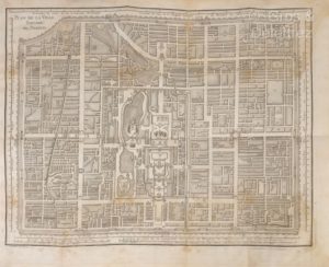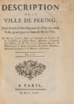 DELISLE (Guillaume), PINGRE (Alexandre-Gui). Description de la ville de Péking pour servir à l'intelligence du plan de cette ville gravé par les soins de M. de l'Isle, par M. de l'Isle. A Paris, de l’Impr. de T.-H. Hérisissant, 1765. In-4, [1] f., 43 p., pl., broché, couverture moderne de papier décoré (mouill. claire sur le texte et soutenue sur les planches; titre de la pl. 1 rogné). Rare édition originale de cette notice, illustrée de 6 planches gravées sur cuivre dont 2 dépliantes, dont un grand plan de Pékin. (Cordier, Bibl. sinica 210-211).