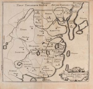 GRESLON (Adrien). Histoire de la Chine sous la domination des Tartares. Où l'on verra les choses les plus remarquables qui sont arrivées dans ce grand Empire, depuis l'anneée [sic] 1651 qu'ils ont achevé de le conquerir, jusqu'en 1669. A Paris, chez J. Henault, 1671. In-8, [8] f., 352 p., pl., parchemin souple époque, dos lisse, titre à l’encre (lac. de couvrure au bord des plats en tête, sur la coiffe et un coin ; trav. de ver sporadique et sans gravité dans des marges int.). Edition originale de cet ouvrage historique dû à Adrien Greslon (1618-1697), jésuite et missionnaire en Chine à partir de 1657 jusqu'à sa mort. Illustrée d’une carte dépliante gravée sur cuivre intitulée « Situs provinciarum Imperii Sinici M.DC.LIV ». (Cordier, Bibl. sinica, 628 ; Sommervogel III, 1738).