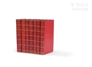 GROSIER (Jean Baptiste Gabriel Alexandre). De la Chine, ou, description générale de cet Empire rédigée d'après les mémoires de la mission de Pé-Kin. A Paris, chez Pillet, 1818-1820. 7 vol. In-8, demi-chagrin rouge époque, dos lisse compartimenté, titre et tomaison doré, roulette, filet et petit fleuron doré. (plats, coupes et coins lég. frottés, lég. rousseurs, petite dech. marginale sur la deuxième carte). Troisième édition revue et considérablement augmentée. Illustrée de 2 cartes dépliantes gravées par Ambroise Tardieu d'après le Père de Mailla. La première est une carte de la Chine rédigée d'après la carte originale, et la deuxième illustre la Tartarie chinoise et les pays limitrophes. Collation : Vol 1: [4]f., LXXX-400 p., [1] f. 2pl. Cartes dépl. / Vol 2: [2] f., 552 p. / vol 3: [2] f., 464 p. / vol 4: [2] f., 512 p. / vol 5: [2] f., 468 p. / vol 6: [2] f., 475 p. / vol 7: [2] f., 472 p. Provenance: Camille Aboussouan (1919-2013), avocat, diplomate, écrivain, et bibliophile franco-libanais (ex-libris).