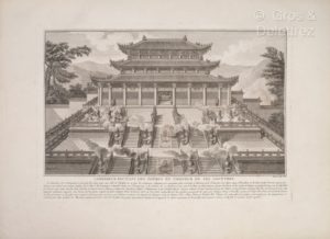 HELMAN (Isidore Stanislas). Suite des seize estampes représentant les conquêtes de l'empereur de la Chine, avec leur explication. A Paris, chez l’auteur, [ca. 1785-1788]. In-plano, [5] f., 24 pl., demi-maroquin à longs grains et à coins rouge tout début XIXe s., dos lisse, roulette, titre et auteur dorés, dos habilement restauré, montage sur onglets modernes soigné (coupes et mors légèrement frottés, petits accrocs en marge pl. V, VI et IX, XVI , poussière au premier feuillet (annonce), qq. rouss. modérées). Très bel exemplaire de cette rare suite de 21 estampes qui reproduisent des scènes de batailles, de victoires et de cérémonies de l'empereur de la Chine, Kien-Long. Les 16 premières planches imprimées entre 1769 et 1774, sont réduites des rarissimes grandes gravures que Cochin réalisa d'après les dessins de Giuseppe Castiglione, artiste missionnaire à la cour de l'empereur ; elles sont l’oeuvre des meilleurs graveurs français de l’époque : Augustin de Saint-Aubin, Jacques-Philippe Le Bas, Jacques Aliamet, Nicolas de Launay, Benoît-Louis Prévost, Pierre-Philippe Choffard Helman, élève de J.P. Le Bas a ajouté 8 planches dont une grande estampe sur 3 feuilles (pl. XVIII, XIX, et XX) illustrant la marche ordinaire de l’empereur de la Chine lorsqu’il passe dans la ville de Pékin. L’exemplaire renferme le feuillet qui fait office à la fois de tableau d’assemblage et de prospectus, intitulé : Suite des seize estampes , en 4 exemplaires ; les 3 premiers sont similaires, et en bas de page du 4ème, il est fait mention de la suite à venir. L’on trouve aussi placé entre les pl.XVI et XVII le feuillet d’annonce des planches supplémentaires numérotées XVII à XX. Cet exemplaire a été tiré sur un papier vergé de la manufacture de T. Dupuy (Auvergne), et de belles marges ont été conservées.