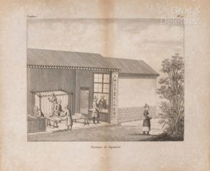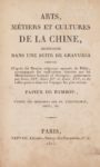 INCARVILLE (Pierre d') ; DENTRECOLLE (François Xavier) ; CIBOT (Pierre-Martial). Arts, métiers et cultures de la Chine, représentés dans une suite de gravures exécutées d'après les dessins originaux envoyés de Pékin, accompagnés des explications données par les missionnaires français et étrangers, pensionnés par Louis XIV, Louis XV et Louis XVI. Art du vernis (par P. D’Entrecolle) [broché à la suite] : Papier de bambou (par Dentrecolle et Cibot). Paris, Nepveu, 1814 & 1815. Deux ouvrages en un volume in-18, 84 p. ; 71 p., broché, couverture illustrée d’origine, à toutes marges (débroché, dos usé).