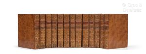 MOYRIAC DE MAILLA (Joseph-Marie-Anne de). Histoire générale de la Chine ou annales de cet Empire traduites du Tong-Lien-Kang-Mou. Paris, Ph.-D. Pierres puis Moutard, 1777-1784. 13 volumes in-4, reliure uniforme veau fauve marbré glacé de l’époque, dos à 5 nerfs, pièces de titre et tomaison rouges et fauves, caissons ornés de petits fers dorés, armes dorées en queue des dos, tranches rouges, quelques restaurations (défauts d’usage dont qq. frott., un mors en partie fendu, une coiffe de queue découverte, qq. rousseurs et f. brunis, mouillures soutenues aux t.8 et 11 avec papier affaibli au début et dans des marges). L’illustration se compose de 24 planches dont 9 dépliantes : 3 cartes de la Chine ancienne et moderne gravées pour la première fois par l’ordre du feu de l’empereur Kang-Hi, 5 tableaux dépliants de différentes dynasties impériales chinoises et un tableau chronologique. Joseph-Marie-Anne de Moyriac de Mailla (1669-1748), jésuite français, fut missionnaire à Pékin. L’édition fut publiée par J.-B. Grosier et revue par M. Le Roux Deshautesrayes. Provenance : Armes aux dos (usées par une trace d'étiquette) ; Banque Industrielle de Chine, Service de Renseignements (cachet moderne sur chaque titre). (Cordier, Bibl. sinica 583-585).