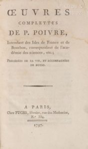 POIVRE (Pierre). Oeuvres complettes de P. Poivre, intendant des isles de France et de Bourbon, correspondant de l'Académie des sciences, etc. ; précédées de sa vie, et accompagnées de notes. A Paris, chez Fuchs, 1797. In-8, IV-301 p., demi-basane fauve époque, dos lisse, titre, filets et fleurons dorés défauts dont coiffe de tête découverte, papier des plats en partie décollé ; titre défraîchi avec mouillure claire, également visible sur qq. autres ff.). Première édition collective, peu commune, d’un intérêt particulier pour ses informations en matière de botanique, dont l’auteur s’était fait une spécialité. Elle renferme : « Voyages d'un philosophe, ou Observations sur les moeurs et les arts des peuples de l'Afrique, de l'Asie et de l'Amérique » ; « Discours prononcé par P. Poivre à son arrivé à l'Isle de France » ; « Discours prononcé à la première assemblée du nouveau Conseil supérieur de l'Isle de France, le 3 août 1767 » ; « Extrait du voyage fait en 1769 et 1770 aux Isles Philippines et Moluques par les vaisseaux... le Vigilant et... l'Etoile du matin... » ; « Lettre de M. Poivre au P. Coeurdoux » ; « Rapport fait à l'Académie des sciences sur le transport des plans de cannelliers et de girofliers à l'Isle de France » ; « Extrait du Voyage aux Indes et à la Chine », par Sonnerat.