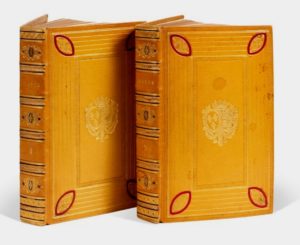 Paris, Lefèvre, 1823. 2 volumes in-8 (230 x 145 mm). Maroquin citron à long grain, filets dorés et roulettes à froid en encadrement, mandorles de maroquin rouge mosaïquées dans les angles, armes dorées, dos à faux-nerfs richement orné et mosaïqué de maroquin brun, roulette intérieure, tranches dorées (Simier r. du roi, signature en pied du tome I).