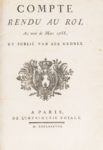 [BRIENNE. Etienne-Charles de Loménie de]. Compte-rendu au Roi, au mois de mars 1788 Paris. Imprimerie Royale, 1788. 1 volume in-4, basane fauve, dos lisse orné, tomaison (l'ouvrage devait faire partie d'une série de mémoires sur les finances). Reliure usagée. Édition originale. Exemplaire interfolié par endroit, avec parfois quelques annotations manuscrites. La publication annuelle d'un compte-rendu des dépenses et des recettes de l'État était l'une des promesses de l'archevêque de Toulouse, Loménie de Brienne, quand il accepta la succession de Calonne au Contrôle général.