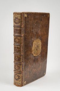 CALMET. Augustin. Histoire généalogique de la maison du Châtelet, branche puînée de la Maison de Lorraine. Nancy. Imprimerie de la veuve de Jean-Baptiste Cusson. 1741. 1 volume in-folio, veau brun marbré, dos à nerfs orné, pièce de titre rouge, encadrement de triple filet doré avec fleurs de lis en écoinçon sur les plats. Illustré de 23 planches gravées hors-texte, de 10 tableaux généalogiques, et de nombreuses armes et figures dans le texte. Magnifique généalogie d'apparat commanditée par la maison du Châtelet. Précieux exemplaire de présent aux armes de la famille du Châtelet poussées au centre des plats (OHR 67). Deux coiffes rognées, coins frottés. Ex-libris Alix.