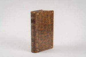 [CAZOTTE. Jacques]. Ollivier, poëme. 1763. 2 tomes en 1 volume in-8, veau fauve marbré, dos à nerfs orné de motifs alternés de fleurs de lis, de pointes d'hermines et de Saint-Jacques, encadrement de triple filet doré sur les plats avec les mêmes motifs en écoinçon. Manque de cuir en coiffe supérieure. Edition originale. Ex-libris Charles-Paul de Bourgevin de Vialart de Moligny et Georges Hugnet,