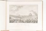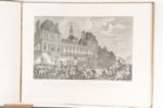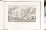 [COLLECTION de QUINZE ESTAMPES sur les PRINCIPALES JOURNEES de la REVOLUTION]. Paris. 1793-1802. 1 volume in-folio à l'italienne, 15 planches gravées, demi-toile XIXème modeste, manque au dos. Une des plus rares suites iconographiques sur la Révolution française. Elle a été réalisée d'après les dessins de Monnet, gravée par Helman. 1). Ouverture des Etats-Généraux à Versailles, le 5 mai 1789. 3e état. 2). Serment du Jeu de Paume. 3e état. 3). Prise de la Bastille. 2e état. 4). Assemblée Nationale. Abandon de tous les Privilèges. 2e état. 5). Fédération générale des français au Champ de Mars, 14 juillet 1790. 3e état. 6). Journée du 10 août 1792. 2e état. 7). Pompe funèbre en l'honneur des martyrs de la journée du 10 dans le jardin national, le 26 août 1792. 2e état. 8). Journée du 21 janvier 1793. 2e état. 9). La fontaine de la régénération sur les débris de la Bastille le 10 août 1793. 2e état. 10). Journée du 16 octobre 1793. 2e état. 11). Le IX thermidor an II. 2e état. 12). Journée du Ier prairial de l'an III. 2e état. 13). Journée du XIII vendémiaire de l'an VI. 2e état. 14). Le IX floréal an VII. Assassinat des plénipotentiaires français au Congrès de Rastadt. 1er ou 2e état. 15). XIX brumaire de l'an VIII. Bonaparte à Saint-Cloud. 2e état. Quelques taches brunes dans les marges inférieures, quelques rousseurs, déchirure marginale dans le bas de deux planches n'atteignant pas la cuvette. Tourneux, I, 292.