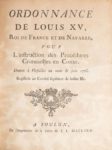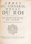 Exceptionnel recueil de pièces manuscrites et imprimées illustrant le retour puis l'installation du pouvoir royal en Corse après la cession de la Corse par les Génois et la défaite de Paoli. 29 ordonnances, arrêts, édits imprimés à Bastia chez Sébastien François Batini. En tête du volume 80 pages manuscrites, d'une belle écriture : Distance entre différentes villes de Corse. Différents manuscrits fixant les tarifs journaliers des tailleurs de pierre, maçons, couvreur, menuisier, employés pour les travaux du roi ; des règles de procédure ; le traitement des prisonniers ; entretien des auditoires des prisons ; frais divers ; coût du papier ; tarifs pour l'exécuteur de la haute justice (pour trancher la tête, 100, pour brûler, 50) État des Communautés, villages et hameaux de l'Isle de Corse, avec leur distance tant de la paroisse que du lieu où est établie la juridiction Parmi les ordonnances imprimées, on peut noter : Ordonnances de Louis XV pour l'instruction des Procédures Criminelles en Corse. Edit du Roi pour la reconnoissance de la Noblesse dans l'Isle de Corse. Edit du Roi pour fixer le Dénier de la Constitution dans l'Isle de Corse. Edit du Roi concernant les Mesures champêtres et la Police des campagnes en Corse. Arrêt du conseil d'État du Roi portant règlement pour les chemins de Corse. Arrêt du conseil d'État qui exempte de la Subvention les Mulets, Anons et Poulains nés en Corse, et qui en affranchit également les Veaux et Génisses qui demeureront à leurs Propriétaires (Liste détaillée sur demande).