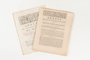 [EAUX et FORETS, PÊCHE et CHASSE]. Réunion de 4 Arrêts et Lettres Patentes. 1763-1780. In- 4, dérelié. Pêche sous les arches de ponts de Meulan, Poissons des pêches étrangères, chasses de l'apanage du duc d'Orléans