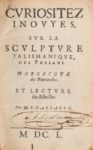 GAFFAREL. Curiositez inouyes sur la sculpture talismanique des Persans. Horoscope des patriarches et lecture des Estoilles. 1650. 1 volume in-8, vélin ivoire souple à rabat. Illustré de 2 planches hors texte. Notes manuscrites sur les feuillets de garde. Ex-libris manuscrit sur la page de titre G. A. Montmorin et sur la coupe Lafon.