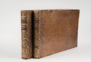 HÜBNER. Johann. Genealogische Tabellen, of Geslacht-Rekenkundige Tafelen Leyde. Dirk Haak. 1729-1735. 2 volumes in-4 oblong, veau fauve légèrement frotté, dos à nerfs ornés, pièces de titre et de tomaison rouge, encadrement de simple filet à froid sur les plats. Version en néerlandais de ce recueil des généalogies des familles souveraines de l'Europe, illustré 666 tableaux généalogiques.