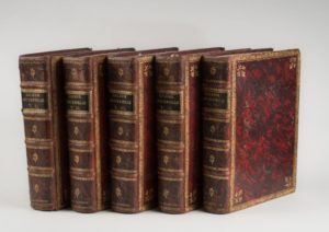 IMBERT DE LA PLATIERE. Galerie universelle des Hommes qui se sont illustrés dans l'empire des Lettres Paris. L'Auteur. 1787-1789. 75 livraisons reliées en 5 forts volumes in-4, maroquin rouge flammé, dos orné à nerfs, pièces de titre en maroquin noir, roulette dorée d'encadrement sur les plats, fleurons aux angles. Collection complète de cette galerie de portraits gravés en manière noire par Des Rais et Benoist. Bel exemplaire en maroquin provenant de la bibliothèque du marquis des Portes. Quelques menus défauts.