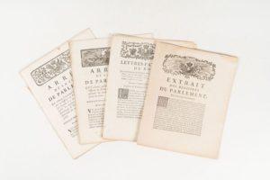 [INCENDIES]. Réunion de 9 Arrêts et Extrait des Registres du Parlement. 1776-1785. In-4, dérelié. Prévention et réparation des incendies à Sens, Saint-Dizier, Saint-Quentin, Auxerre