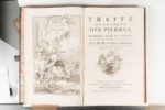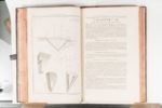 DE LA RUE. Traité de la coupe des pierres, ou méthode facile et abrégée pour se perfectionner en cette science. Paris. Charles-Antoine Jombert. 1764. 1 volume grand in-folio plein veau marbré, dos à nerfs orné, pièce de titre de maroquin rouge. Ouvrage remarquable par l'abondance et la qualité de ses illustrations, un titre gravé et 73 planches gravées numérotées, la plupart dépliantes, avec de nombreuses planches répétées recto-verso ou sur des feuillets séparés pour permettre une compréhension optimale du texte en regard. On joint à l'ouvrage un joli dessin à la plume aquarellé du XVIIIème siècle, représentant un lanternon et sa charpente (22 x 35 cm). Discrètes restaurations aux mors, petites épidermures sur les plats et taches brunes sur le second plat, pâle mouillure marginale.