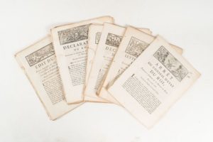 [MONNAIE]. Réunion d'environ 60 Arrêts, Ordonnances, Lettres Patentes 1776-1785, in-4, dérelié. Très important ensemble sur tous les aspects de la monnaie : fabrication, administration, valeur. Quelques pièces concernent l'orfèvrerie.