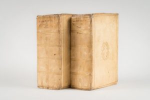 PLUTARQUE. Les Oeuvres morales de Plutarque A Lyon. Pour Paul Frellon, et Abraham Cloquemin. 1594. 3 parties en 2 volumes in-8, vélin doré souple, filet doré d'encadrement sur les plats, couronnes de laurier au centre, dos orné, tranches dorées. Traduction de Jacques Amyot. Marque de Frellon au titre. Bel exemplaire en vélin du temps.