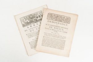 [POUDRES et SALPÊTRE]. Réunion de 4 Arrêts et Ordonnances. 1775-1784. In-4, déreliés.