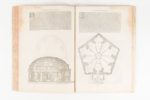 SERLIO. Sebastiano. Regole generali di Architectura. In Venetia. [pour Giovanni-Battista et Melchiore Sessa. vers 1559-1562]. 74 ff. Relié avec : Quinto Libri d'Architecttura. In Venetia appresso Gio. Battista et Marchio Sessa fratelli. 1559. 18 ff. Recueil de 2 ouvrages reliés en 1 volume in-folio, parchemin moderne, dos lisse avec titre à l'encre. 1. Belle édition ancienne en italien du Livre IV, consacré aux Cinq ordres d'architecture antiques, illustrée d'un encadrement au titre et de 127 compositions dont une quarantaine à pleine page. Quelques taches marginales, petite déchirure portant atteinte à la gravure du feuillet MM1. 2. Deuxième édition en italien du livre V, consacré à l'architecture sacrée, illustrée d'un titre et de 29 compositions dont 2 à pleine page Large mouillure rousse sur tous les ff., quelques traits à l'encre sur la date du colophon. ex-libris manuscrit ancien : este libor es de el pader don Juan Ramires religioso de la Cartuga del Paular. Une autre main ancienne a inscrit en dessous : « mientes q[ue] no es tu l[ibro] », c'est-à-dire « tu mens, ce n'est pas ton livre ».
