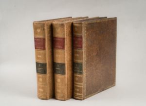 Dictionnaire de l'Académie française. Paris. Bossange et Masson, Garnery, Nicolle. 1814. 3 volumes in-4 carrés, plein veau moucheté légèrement frotté, frise dorée en encadrement sur les plats, dos lisses ornés et passés, pièces de titre de maroquin rouge à long grain et de tomaison de maroquin vert. Cinquième édition, revue, corrigée et augmentée.