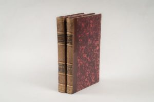 DROUINEAU. Gustave. Résignée. Paris. Charles Gosselin. 1833. 2 volumes in-8, demi-veau aubergine, dos à nerfs ornés et passés, pièces de titre et de tomaison en maroquin beige. Reliure signée Bradel. Seconde édition illustrée de frontispices. Après le succès de "Rienzi" qui inspira à Wagner l'opéra "L'Espion", Drouineau plongea dans la spiritualité, en 1833, puis créa une secte, arrêta d'écrire, et fut interné sur demande de sa famille. Ce "roman religieux", selon les mots de l'auteur, marque ce tournant spiritualiste.