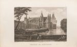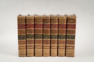 DULAURE. Jacques-Antoine. Histoire physique, civile et morale des Environs de Paris Paris. Levavasseur, succ. de Ponthieu. 1829. 7 volumes in-8, demi-basane havane frottée, dos lisses ornés,, pièces de titre et de tomaison. Remise en vente de la première édition de 1825-1828, illustrée de 82 planches, avec un titre de relais. Cet exemplaire est enrichi de deux lettres manuscrites, une d'un juge de paix de Chartres, M. Bouvier-Mézières, qui signale à l'auteur quelques erreurs à rectifier; puis la réponse de Dulaure, qui révèle quelle a été sa véritable contribution dans la parution de l'ouvrage. En effet, il explique qu'il ne s'était engagé "qu'à faire deux volumes ou tout au plus trois" et que l'éditeur, passant outre, en a fait paraître sept. "Cette contravention m'a dégoûté de l'ouvrage ». Sans la carte annoncée au titre. Quelques rousseurs. Coiffes du tome 7 abimées.