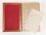 DUMAS. Fils. Alexandre. Théâtre Complet, avec préfaces inédites. Paris. Calmann Lévy. 1890-1894. 9 volumes in-8, plein maroquin rouge janséniste, dos à nerfs, tranches dorées sur témoins, doublures de maroquin rouge, encadrées de 7 filets dorés, garde de soie, couvertures conservées, sous étui. Reliures signées CARAYON. Théâtre complet d'Alexandre Dumas fils, illustré par Robaudi. Toutes les illustrations sont en triple état : eau-forte pure, avant la lettre et état définitif. Tirage limité à 135 exemplaires sur grand papier vergé. Exemplaire de Robaudi, l'illustrateur de l'ouvrage, enrichi d'un envoi autographe de Dumas fils : "À Monsieur Robaudi avec tous mes plus sincères compliments pour les illustrations que cette édition lui doit." Sont jointes deux lettres de l'auteur à Catulle Mendès, une sur double page et sur un feuillet bleu déchiré en 2, sans manque. Très bel exemplaire parfaitement relié en maroquin rouge doublé.