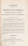 (ENREGISTREMENT) - Code des droits de timbre, d'enregistrement, de greffe et d'hypothèque. Paris. Clament frères. 1810. 1 fort volume in-8, basane marbrée légèrement frottée, dos lisse orné, encadrement de pointillé et guirlande dorés sur les plats. Manque à la coiffe supérieure, plats et dos un peu frottés. Edition originale. Ex-libris Serge Le Tellier.