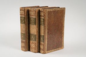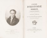 GUIZOT. François. Histoire générale de la civilisation en Europe, depuis la chute de l'Empire romain jusqu'à la Révolution française. Paris. Pichon et Didier. 1828. 44 leçons en 3 volumes in-8, basane fauve granitée, dos lisse orné et frotté, pièces de titre vertes, encadrement de dent-de-rat, filet et guirlande dorés sur les plats. Edition originale, illustrée d' un portrait-frontispice, du cours de l'été 1828, qui sera ensuite complété jusqu'en 1830 par l'Histoire de la civilisation en France depuis la chute de l'Empire romain jusqu'en 1789. La série complète forme six volumes : nous avons les quatre premiers volumes répartis en trois tomes. Page de titre et de faux-titre pour le tome 1 uniquement.