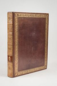 POUGENS. Trésor des origines, et Dictionnaire grammatical raisonné de la langue française. Spécimen. Paris. Imprimerie Royale. 1819. 1 volume in-4, veau aubergine, dos à faux-nerfs orné passé, monogramme couronné sur une pièce de maroquin rouge, encadrement de roulette à froid, large guirlande dorée et roulette intérieure à froid sur les plats avec fleurons d'angle. Reliure anglaise signée Carroll. C'est tout ce qui a paru de l'immense travail lexicographique qui occupa Pougens dans ses dernières années. Il ne put achever le grand dictionnaire étymologique qu'il ambitionnait. Le présent ouvrage porte pour cette raison le sous-titre de « spécimen". Coiffes et mors restaurés.