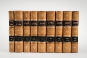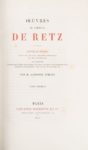 RETZ. Cardinal de. OEuvres Paris. Librairie Hachette. 1870-1887. 9 volumes in-8, demi-basane havane, dos ornés à nerfs,, pièces de titre et de tomaison, têtes dorées. Exemplaire sur papier vergé. Collection Les Grands Écrivains de la France. Les OEuvres du cardinal de Retz, éparses jusqu'à la fin du XIXe siècle, sont réunies pour la première fois dans cette édition. Sans les deux derniers volumes : le T. X (la notice biographique, le lexique et l'index) et l'Album paru en 1920. Vicaire annonce un Supplément (27 pp. à la fin du T. VIII) qui ne figure pas ici. Ex-libris Lucem amare et amore lucere. Quelques rousseurs.
