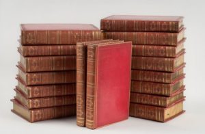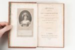 STAËL. Anne-Louise-Germaine Necker, Baronne de. OEuvres complètes de Mme la baronne de Staël, publiées par son fils Paris. Treuttel et Würtz. 1820-1821. 17 volumes in-8, plein maroquin rouge à longs grains légèrement frottées, un filet doré et un décor à froid en encadrement sur les plats, dos lisses passés, tranches dorées. Reliures signées P. Lalande. Édition en partie originale, illustrée d'un portrait frontispice de l'auteur et contenant une notice sur la vie et les oeuvres de Mme de Staël par Mme Necker de Saussure. Ces oeuvres complètes renferment un grand nombre de morceaux inédits et des additions importantes de l'auteur. Le premier tome est augmenté de deux lettres autographes in-12 signées par Mme de Staël : - la première, signée N. de Staël, datée du vendredi 2 octobre, est adressée à Vivant Denon. Elle lui propose "de vous donner à dîner avec Lord Wellington, mais le mauvais temps a tout retardé..."; elle lui propose une autre date "je vous demande d'en être - nous parlerons de l'Afrique et vous m'aiderez à me la figurer". Vivant Denon accompagna en effet Bonaparte en Egypte, puis fut nommé directeur du Musée du Louvre. - la seconde, signée Necker de Staël, datée de 1812, est adressée à un de ses ami à qui elle recommande de faire le meilleur accueil à son sécrétaire. Ex-libris Franchetti. Quelques notes manuscrites. Reliures assez frottées pour les tomes 1, 5, coins émoussés dans l'ensemble, rousseurs, quelques légères mouillures dans le tome 2, 8, 14.
