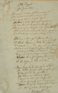 VERLAINE. Paul. Poème autographe signé, 1 feuillet in-8, trace de pliure, petites taches et mouillures, contrecollée par les coins supérieur sur un carton fort. Poème à F. A. Cazals, daté fin juin 1893, publié dans le recueil Invectives, publié chez Vanier en 1896, pages 119-120, sous le numéro LVI, quelques surcharges. Il comprend quelques modifications par rapport au texte imprimé : Le vers 6 se termine par un point d'exclamation. Au vers 9, mort avec un t, qui ne sera pas conservé. Les vers 11-12 sont différents de la version imprimée : « Cernant mon lit, penché au bord, Même elle a fait faux bond ma mort ». Seront transformés dans la version imprimée : « Près de mon lit, rués au bord, Elle a fait quel faux-bond ma mort ». Au vers 15 : Car sera remplacé par Même.