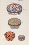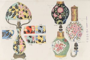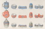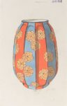 (AQUARELLES). Ensemble de 4 planches d'aquarelles originales (48 x 31 cm), cotées, représentant de la vaisselle, un vase, des boites, des pieds de lampe très colorées. Une note manuscrite au crayon au dos précise qu'il s'agit de projets pour la maison Fourmaintraux à Desvres.