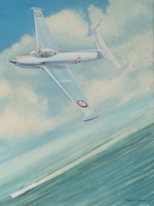 [AVIATION ] - Avion Breguet 960 Vultur. Gouache 58.5 x 43.5. Rousseurs. Gouache figurant le modèle d'avion Breguet 960 Vultur en plein vol. Prototype d'avion d'attaque français, destiné à être embarqué à bord de porte-avions, seuls 3 prototypes furent construits et testés au début des années 1950. Signé en bas à droite "Bouchemy" (?)