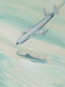 [AVIATION ] - Avion Breguet 960 Vultur rejoignant un porte-avion. Gouache. 58.5 x 43.5. Rousseurs. Gouache figurant le modèle d'avion Breguet 960 Vultur en plein vol rejoignant son porte-avion. Signé en bas à droite "Bouchemy" (?) et daté VIII/48.