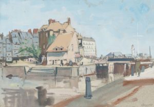 BAUDIER. Paul. La lieutenance, Honfleur Gouache signée en bas à droite, sur papier gris, sous passe-partout. (32,5 x 25,5 cm).