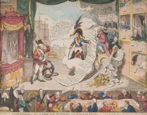 [CARICATURE ANGLAISE]. - [GILLRAY. James]. Pacific overtures - or - a flight from St Clouds over the water to Charley [Londres]. 5 avril 1806. Estampe in-folio oblong, en feuille, cadre de bois doré moderne. Gravure en couleurs, légendée en anglais. Une des piquantes caricatures de Gillray, réalisées au début de la Guerre de la quatrième coalition, et plaçant sur une scène de théâtre d'un côté George III, de l'autre Napoléon.