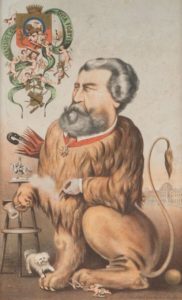 [CARICATURE] - BISETSKY Antoine. Le comte Alfred Emilien de Nieuwerkerke. Paris. Becquet. 44 x 27.5 cm. Cadre contemporain à baguettes en bois doré. Mouillures et rousseurs. Belle caricature montrant le comte Alfred Emilien de Nieuwerkerke en chimère mi-homme, mi-lion. Il pose devant le Louvre, un marteau de commissaire-priseur et un cigare aux mains tandis qu'un petit caniche lui monte dessus et qu'un amour lui coupe ses griffes.