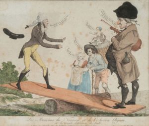 [CARICATURE] - [DEPEUILLE]. Les musiciens du Nouveau et de l'Ancien Régime, ou la grande différence de Poids. (vers 1795 - 1801). Gravure. 23 x 28 cm. Cadre postérieur du XXème siècle à baguettes dorées. Rousseurs. Belle gravure caricaturale réhaussée à l'aquarelle.