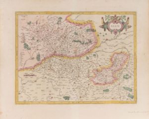 (CARTE D'ANJOU). MERCATOR. Anjou. Mercator. (ca 1600). Gravure sur cuivre. 57 x 46,5 cm. Gravure en coloris ancien. Trace de pliure au centre, avec texte en français au dos.