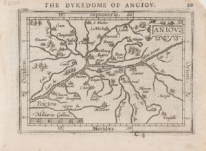 (CARTE D'ANJOU). ORTELIUS. Anjou. ca 1590. Carte gravée sur cuivre. 17 x 12 cm. Gravure coloriée. Texte en anglais au dos.