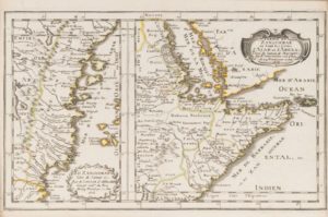 (CARTE DE LA COTE SUD-EST DE L'AFRIQUE). SANSON. 1. Le Zanguebar. 2. Partie du Zanguebar ou sont les Costes d'Ajan et d'Abex... 1656. 32 x 24 cm. Gravure sur cuivre comprenant deux cartes, contours rehaussés en couleurs. Trace de pliure au centre.