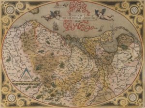 [CARTE] - ORTELIUS. Abraham. Descriptio Germaniae Inferioris. Anvers. Christophe Plantin. (1584). 37.5 x 50.5. Cadre moderne en bois et stuc doré. Belle carte et mise en couleurs de la Basse-Germanie extraite du Theatrum Orbis Terrarum. Carte contenue dans un bel encadrement en trompe-l'oeil d'un oculus. Deux petits chérubins soulèvent le titre de la carte duquel est suspendu deux bandeaux entremêlés, terminés de pampilles.